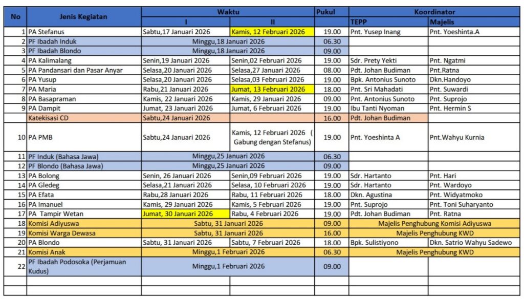ORIENTASI BAKAL CALON PENDETA GKJ MERTOYUDAN FIRMANYU IMANUEL HENDRATA by yusepinang | Feb 11, 2026 | Pengumuman | 0 comments Jadwal Pelayanan Saudara Firmanyu Periode 14 JanuariĀ – 14 Februari 2026 Submit a Comment Cancel replyYour email address will not be published. Required fields are marked *Comment * Name * Email * Website Save my name, email, and website in this browser for the next time I comment.